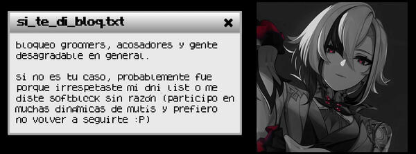 SOY MAYOR DE EDAD, twitteo sobre Genshin impact y a veces sobre animes, me gusta interactuar mucho así que se me ve seguido en el tl. que siga a alguien problematico no significa que esté de acuerdo, soy una persona pacífica en general. twitteo bastante sobre Arlecchino, si sos main/yume de ella podemos ser amig@s siempre y cuando no seas extremadamente intens@, los demás son super bienvenidos.